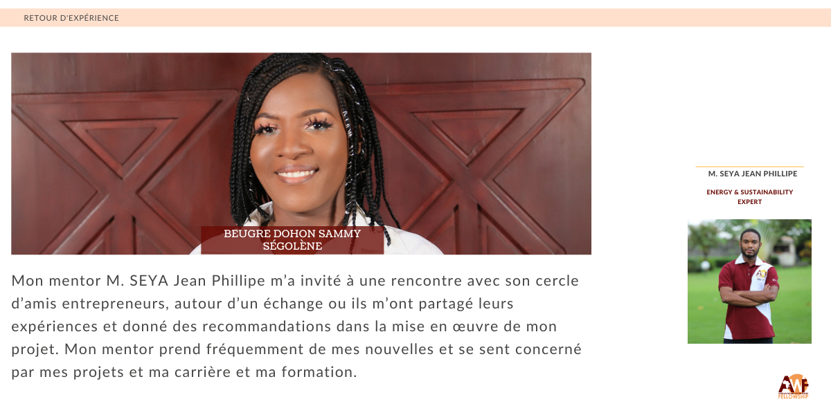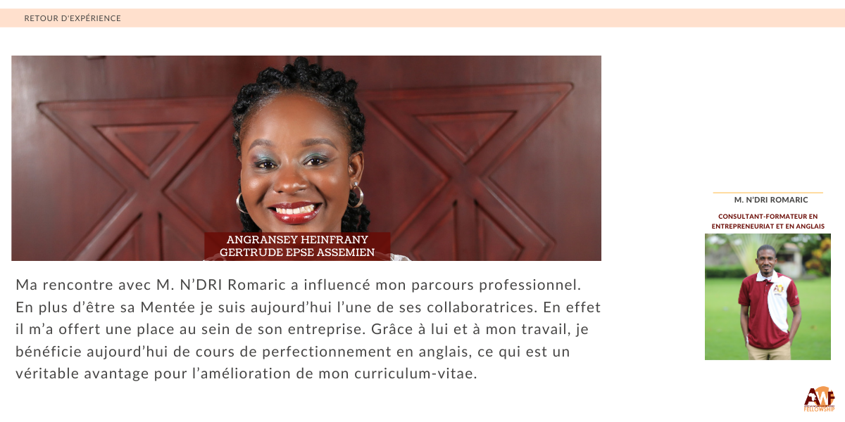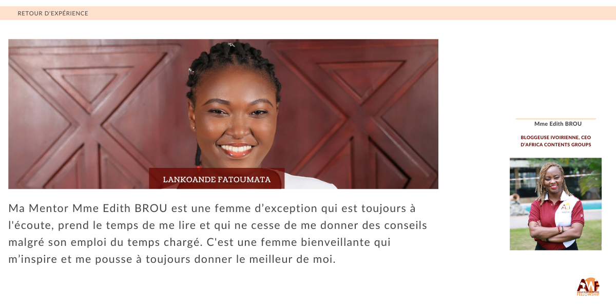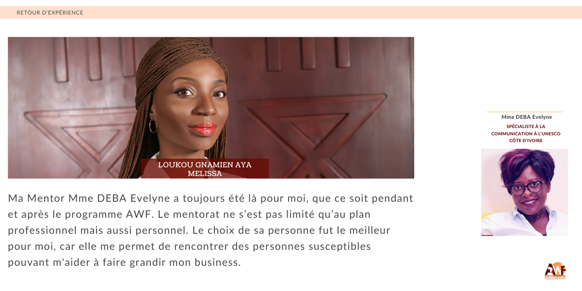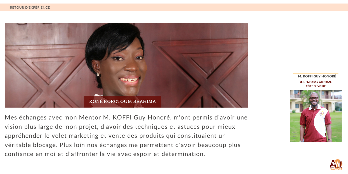 « Le programme AWF m’a appris les bases de la gestion d’entreprise durant 06 semaines intenses de formation et un coaching continu…Grâce au puissant réseau que j’ai pu développer, j’ai aujourd’hui plus de 35 autres contacts dans divers secteurs d’activités pour accélérer tout ce que j’entreprends…La rigueur, la discipline et le professionnalisme sont aujourd’hui au cœur de mon activité. Le résultat est visible, j’ai osé ouvrir ma première boutique et faire mon premier défilé de mode. » Ange Marlène Yao