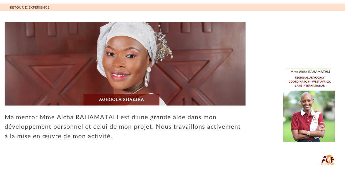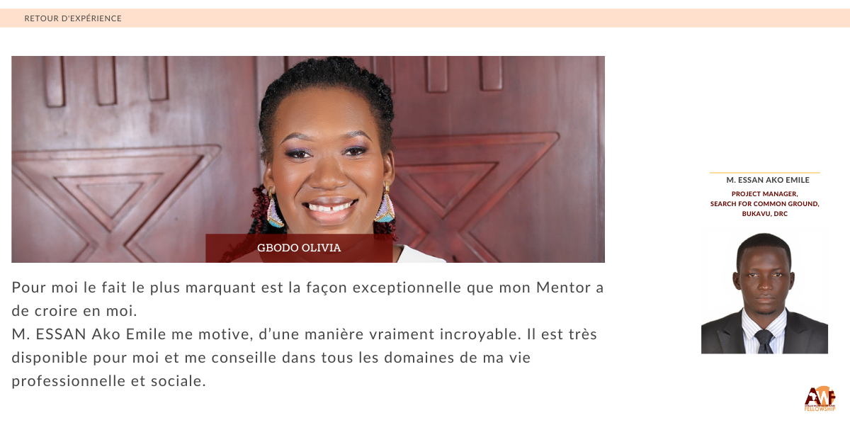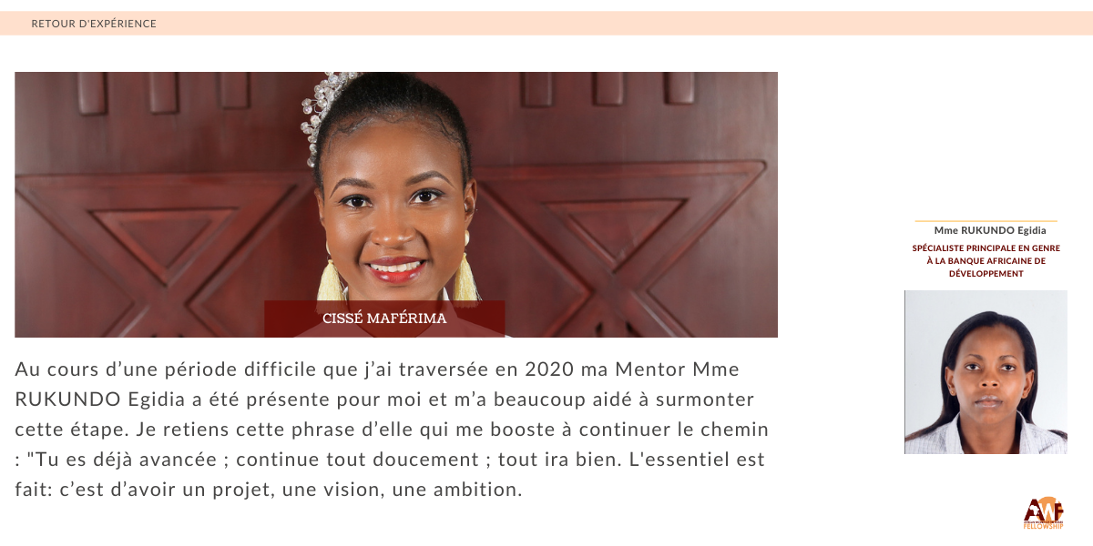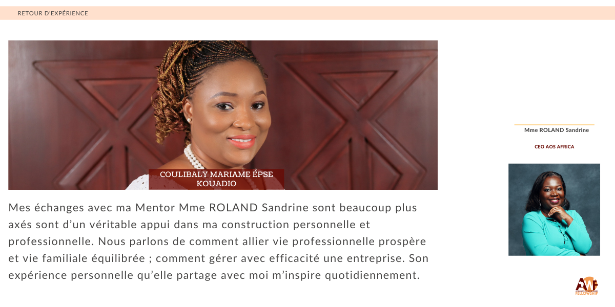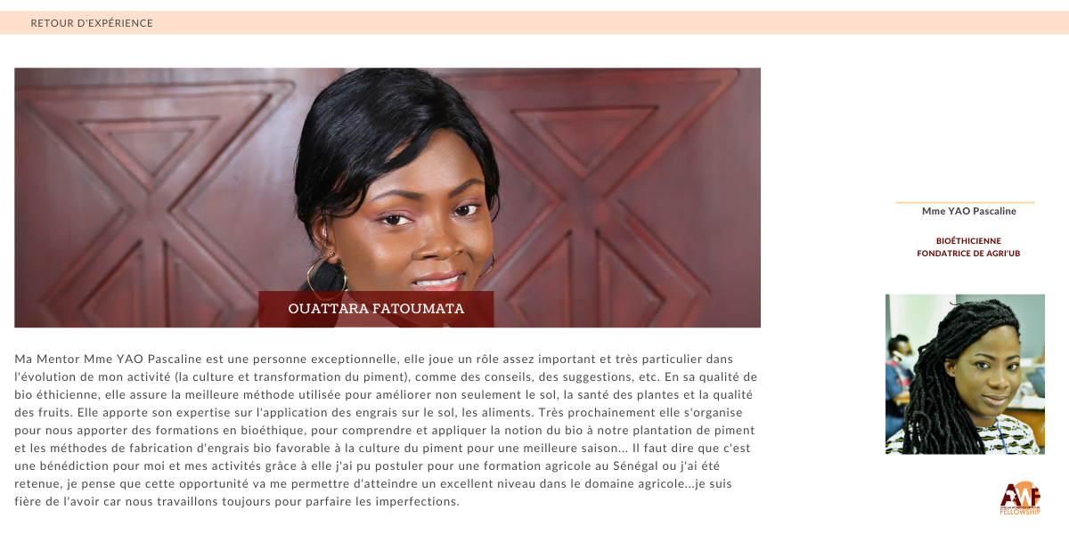 « Le programme AWF m’a appris les bases de la gestion d’entreprise durant 06 semaines intenses de formation et un coaching continu…Grâce au puissant réseau que j’ai pu développer, j’ai aujourd’hui plus de 35 autres contacts dans divers secteurs d’activités pour accélérer tout ce que j’entreprends…La rigueur, la discipline et le professionnalisme sont aujourd’hui au cœur de mon activité. Le résultat est visible, j’ai osé ouvrir ma première boutique et faire mon premier défilé de mode. » Ange Marlène Yao